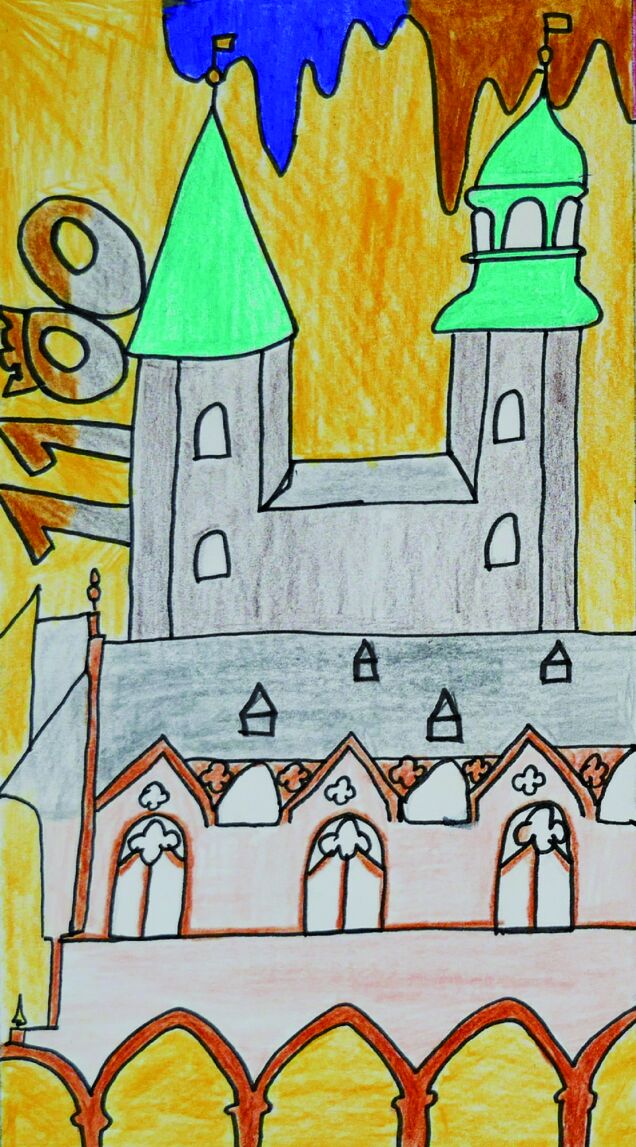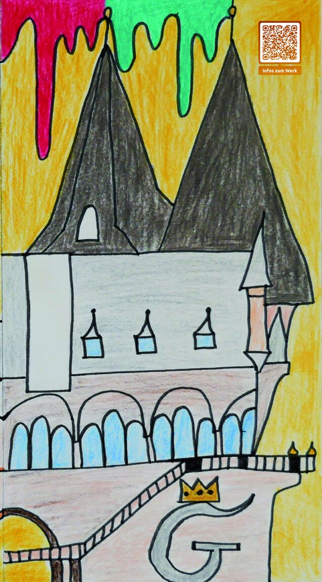Mein Name ist Rima, ich besuche gerade die Fachoberschule Gestaltung an der BBS Goslar- Baßgeige/Seesen. Ich hatte die Aufgabe einige Stromkästen in der Innenstadt von Goslar zu gestalten. Das Thema lautet „WO KREATIVE JUNGE KAISER IHR HERZ VERLIEREN, IHRE PINSEL SCHWINGEN, IHRE KRONE FINDEN“. Ich habe mir dafür gedacht, berühmte Örtlichkeiten von Goslar zusammen zu stellen, wie z.B. das Rathaus, die zwei Türme, das Breite Tor, usw. Ich habe den Hintergrund in Gold gefärbt, da wir in Goslar viel Gold haben, und oben habe ich die Farben unseres Schullogos ausgewählt. Ich habe es das Schloss genannt, da die Zusammenstellung wie ein Schloss aussieht. Ich habe auch die 1100 gezeichnet, damit es zum Thema passt.